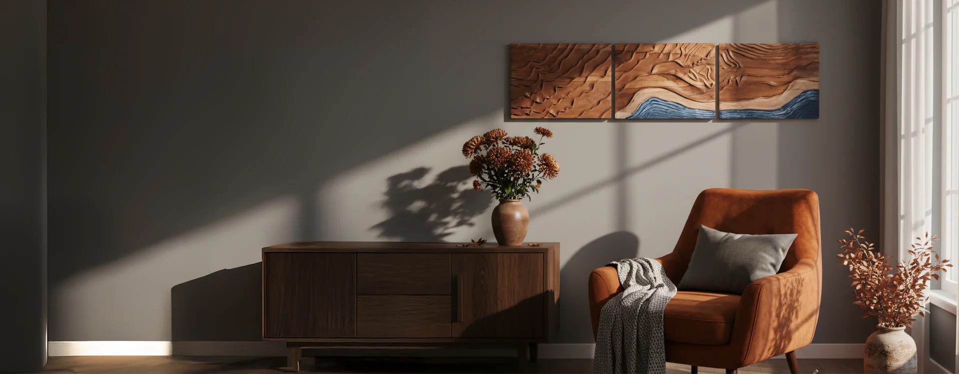 This hand-carved teak wood set beautifully captures movement and fluidity through organic swirls and wave forms.Each panel in the trio brings its own ..